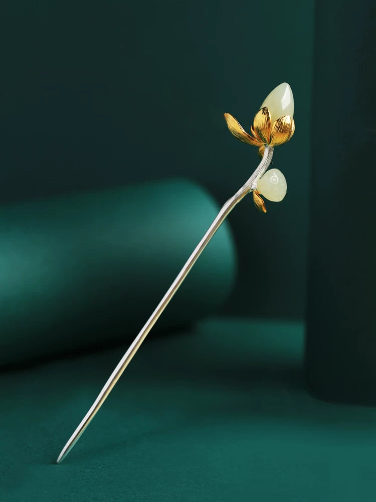 Lotus Leaf Silver Hairpin with Hetian Jade