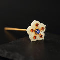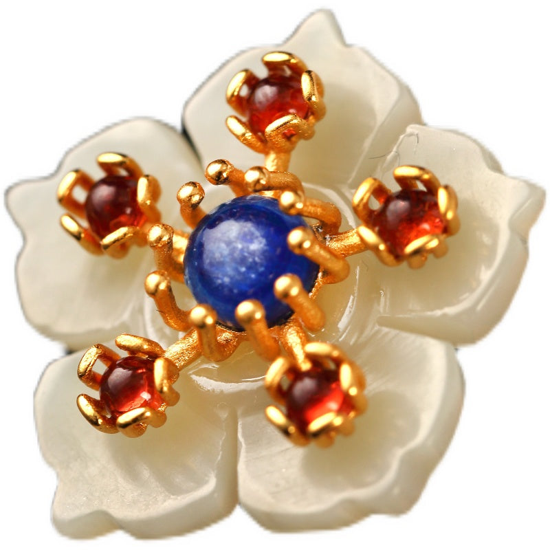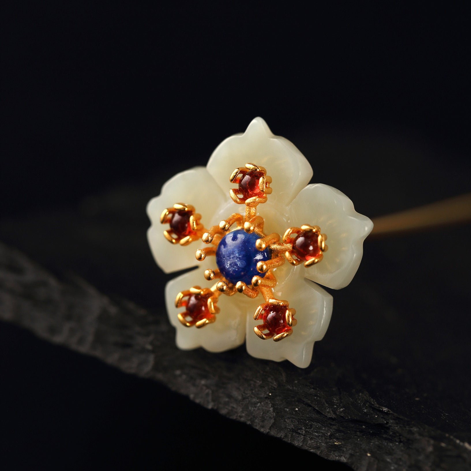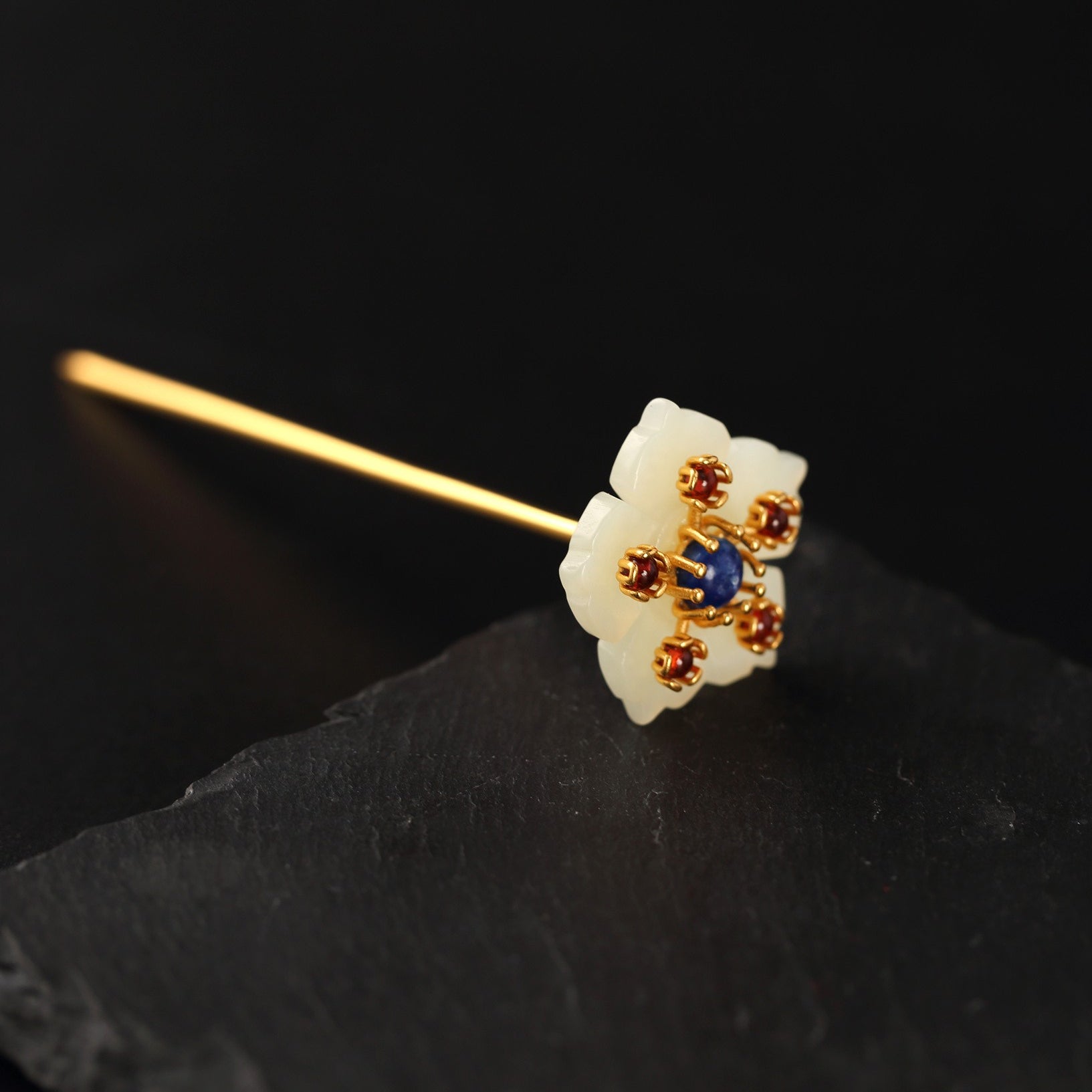 Design: It is inspired by the Ming Dynasty white jade hairpin, and the original one only has sapphire. We use red garnet to add layers to the color of the whole flower, which is very luxurious. The hairpin is small and practical and can match almost any hairstyle. We highly recommend using 2 pieces together on the bun.