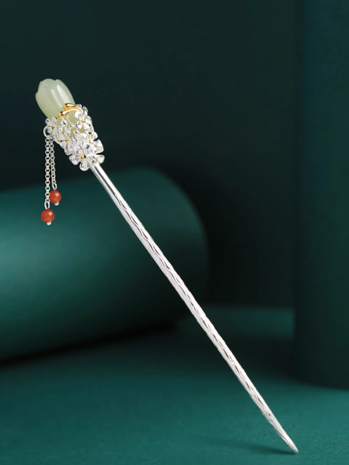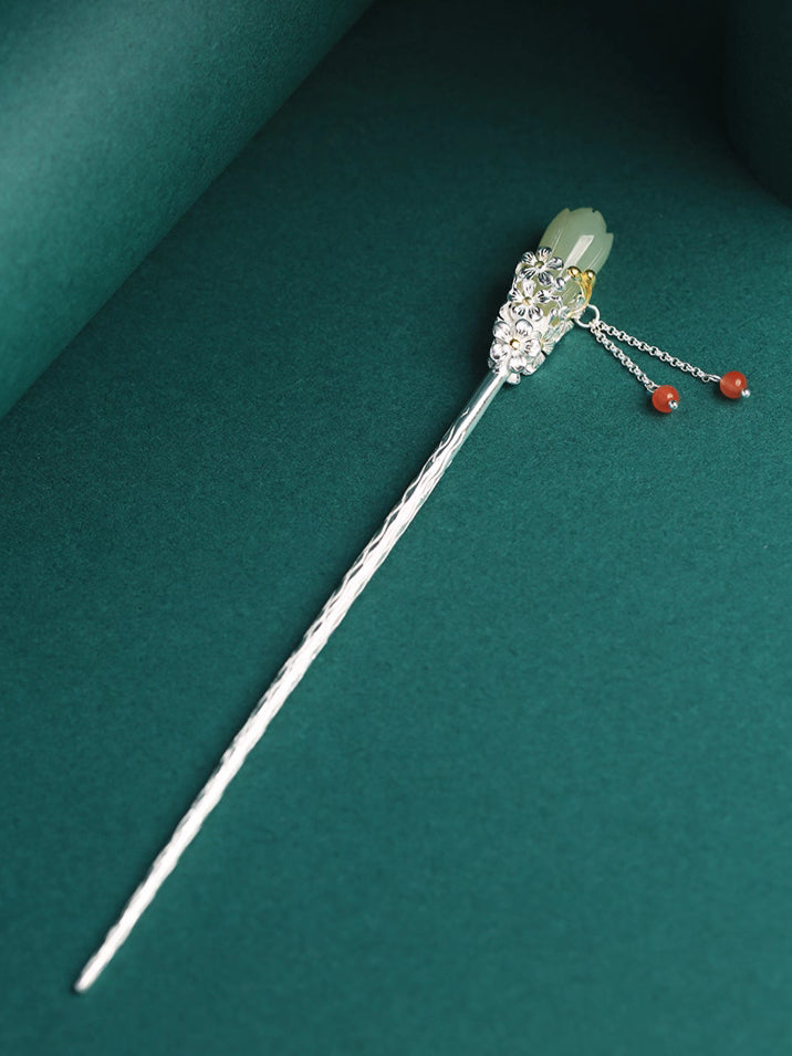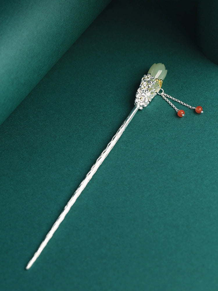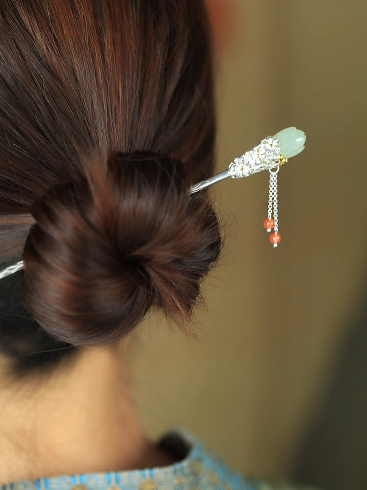 Design: This hair accessory has such a lovely ancient vibe—super elegant! The petals and leaves are all hand-hammered, so the details are so intricate. The tassel is made with natural red agate, and the whole hairpin is solid S925 sterling silver through and through. It works for everyday wear or ancient-style outfits—perfect to keep for yourself or give as a gift. You'll love it!