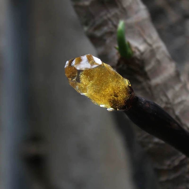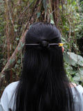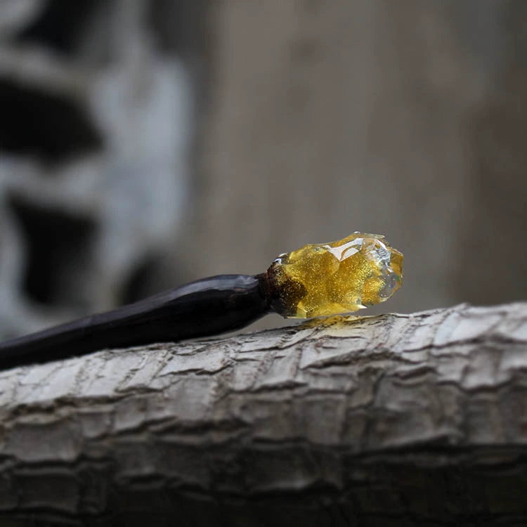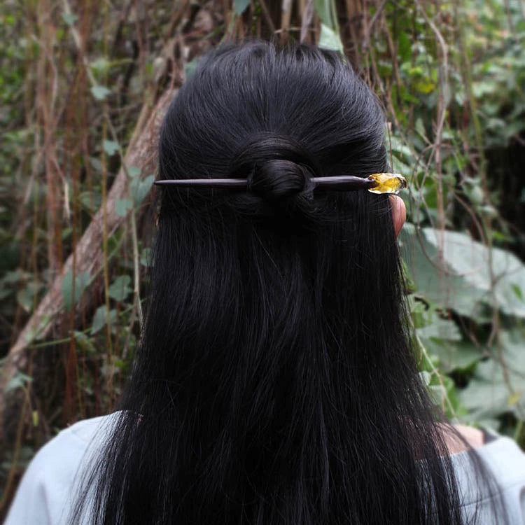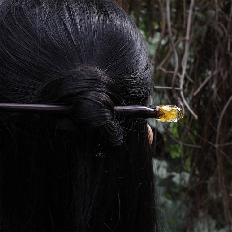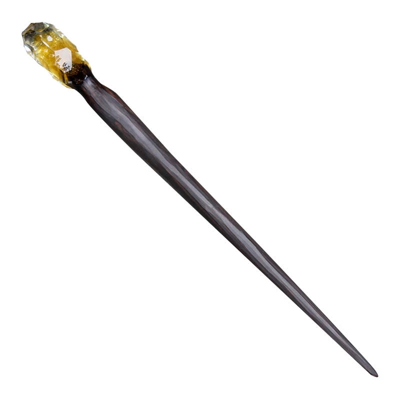 Design: This hair stick is made entirely by hand from start to finish, without the use of any molds, ensuring that no two are exactly alike. The purely handcrafted nature means some traces of handwork are inevitable, so please consider this before purchasing if such details concern you. For the resin and ebony wood connection, the parts are fused first before shaping, not glued post-formation, which makes the joint considerably sturdy.