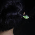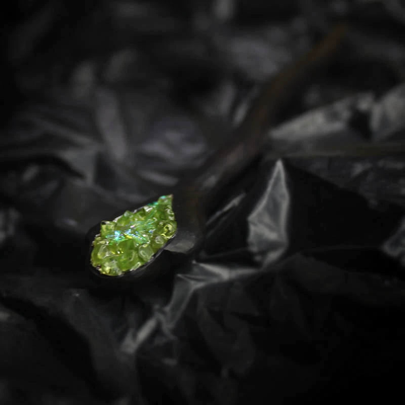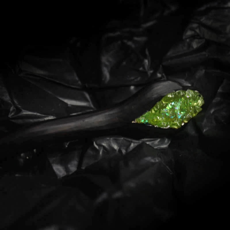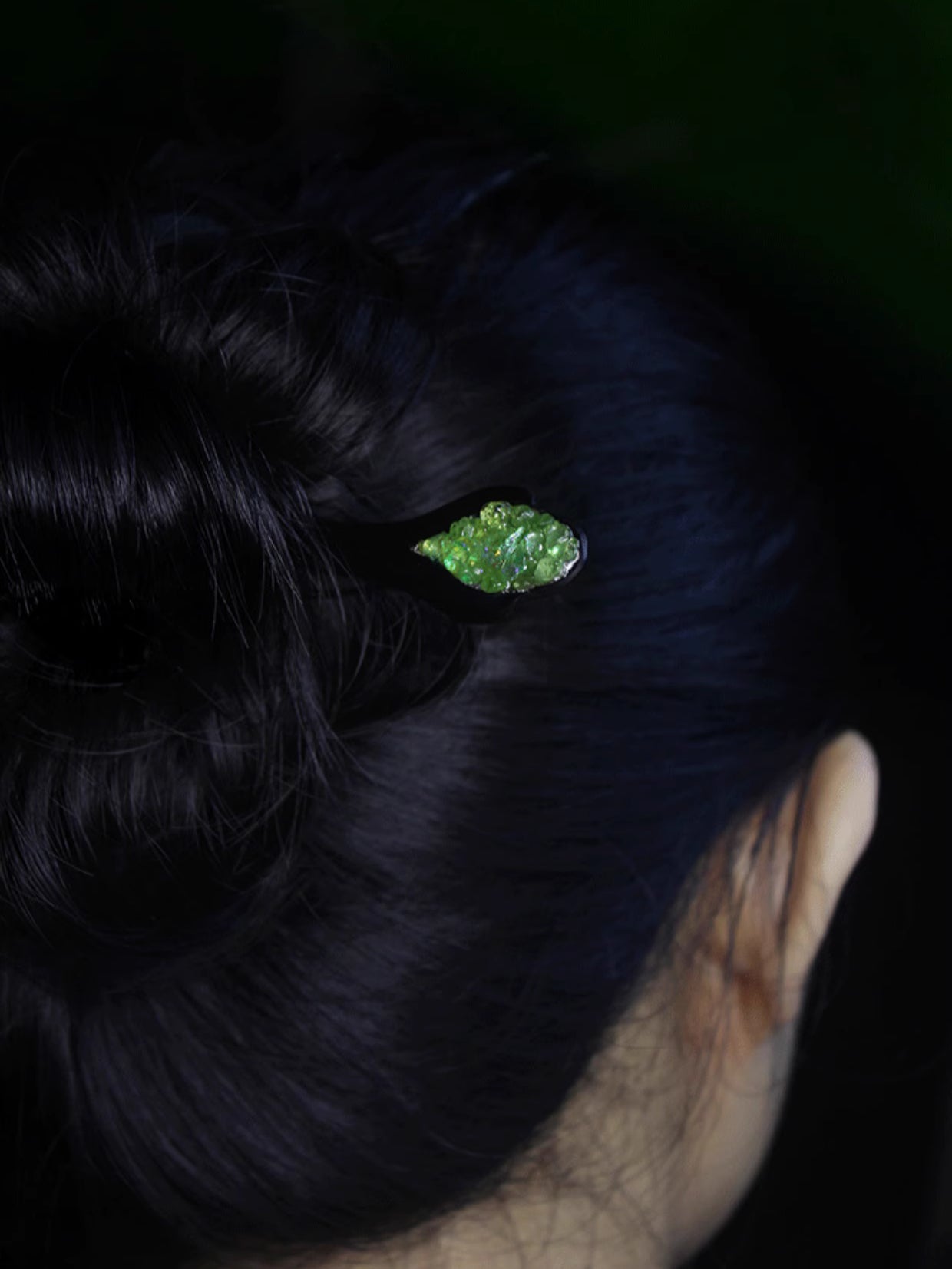 Material: The green part is peridot, and the hair stick body is made of Zitan wood (also known as black sandalwood). Zitan wood is not purely black. Natural wood all has water channels and pores.