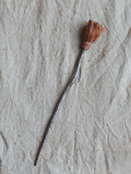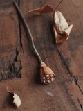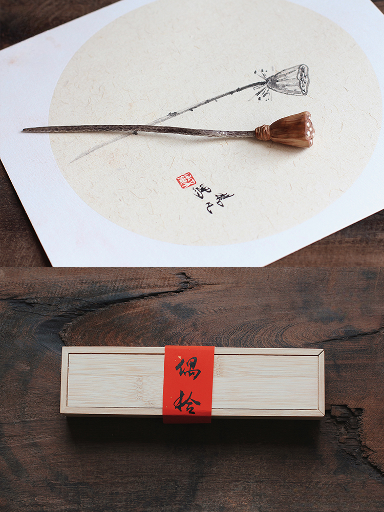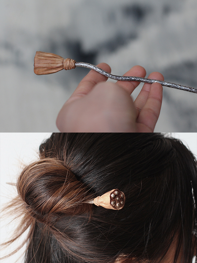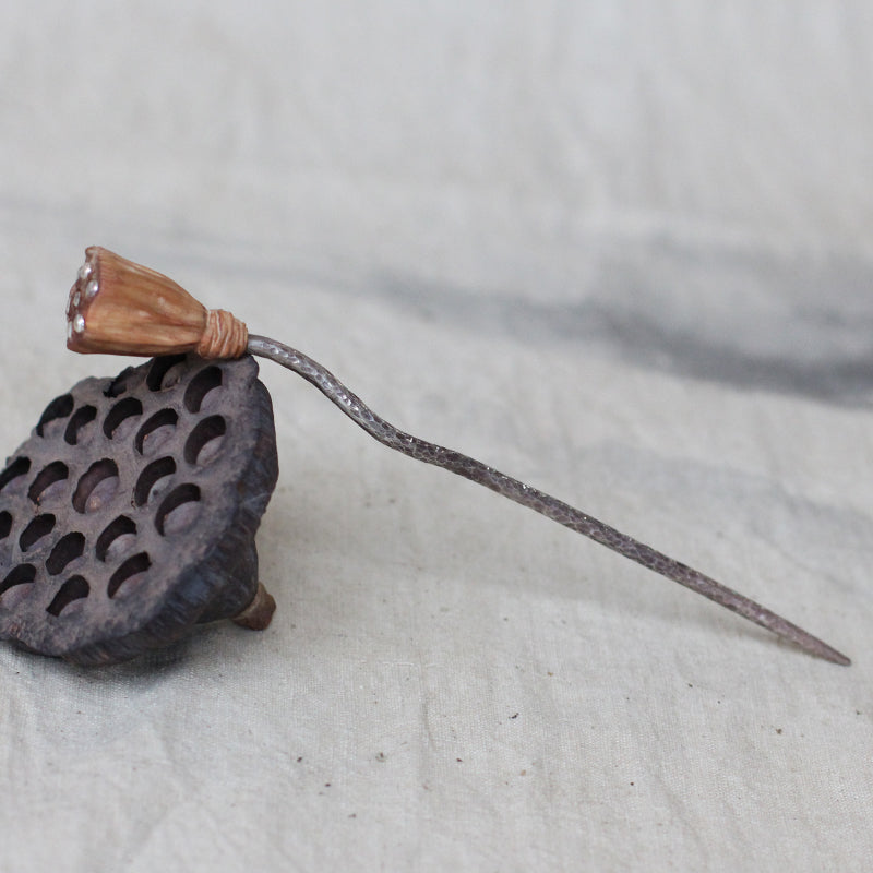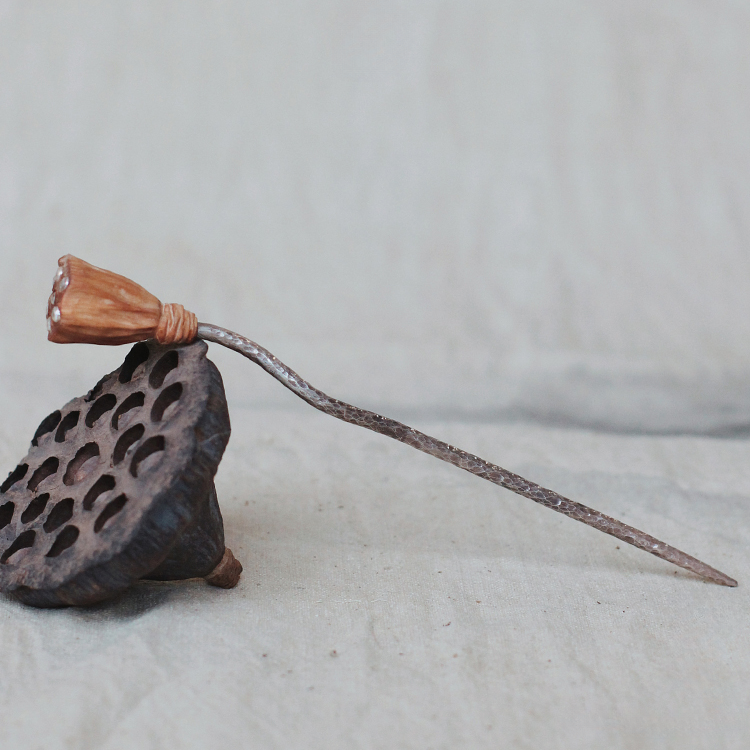 Design: Introducing the second piece in our Ou shi series - "Ou Shi" or "Lotus Seed." The name cleverly plays on the homophone "Ou Shi," which refers to the serendipitous process of discovering inspiration. This unique hair stick features a lotus seed design crafted with a bold yet intricate carving technique, intentionally leaving the carving marks to capture the essence of a withered lotus seed standing tall and proud. The hair stick is made of 925 silver with a hammered texture finish.
