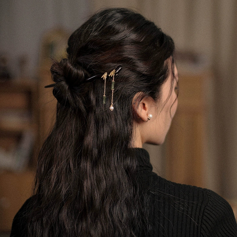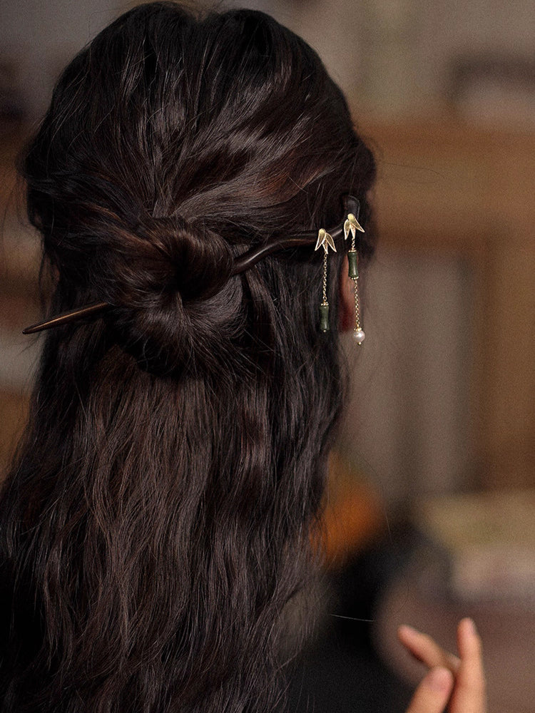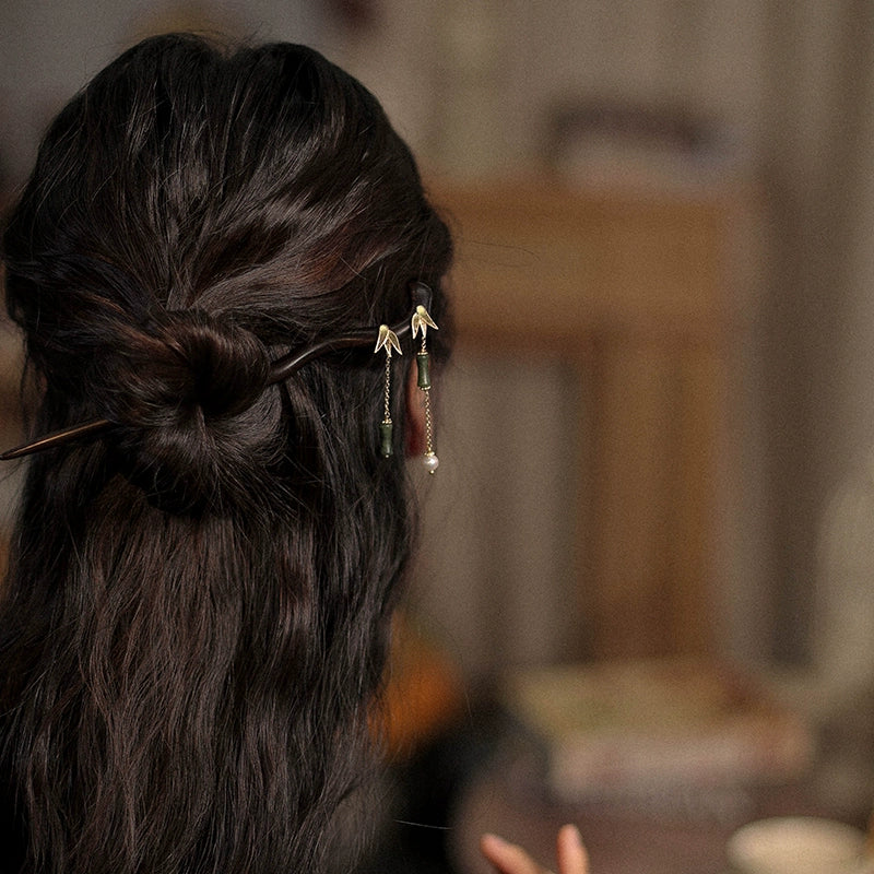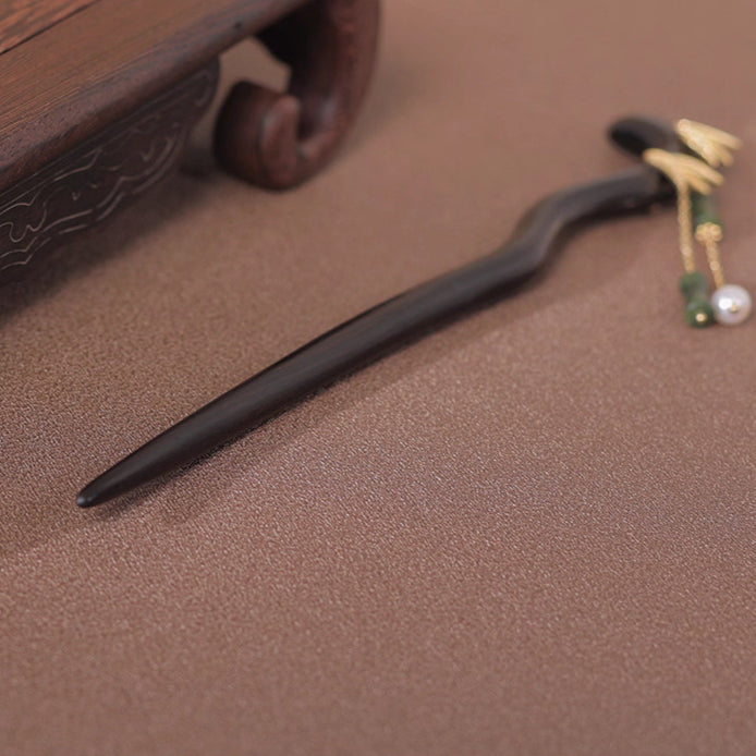 Handmade Sandalwood Hair Stick with Bamboo Leaf Tassel