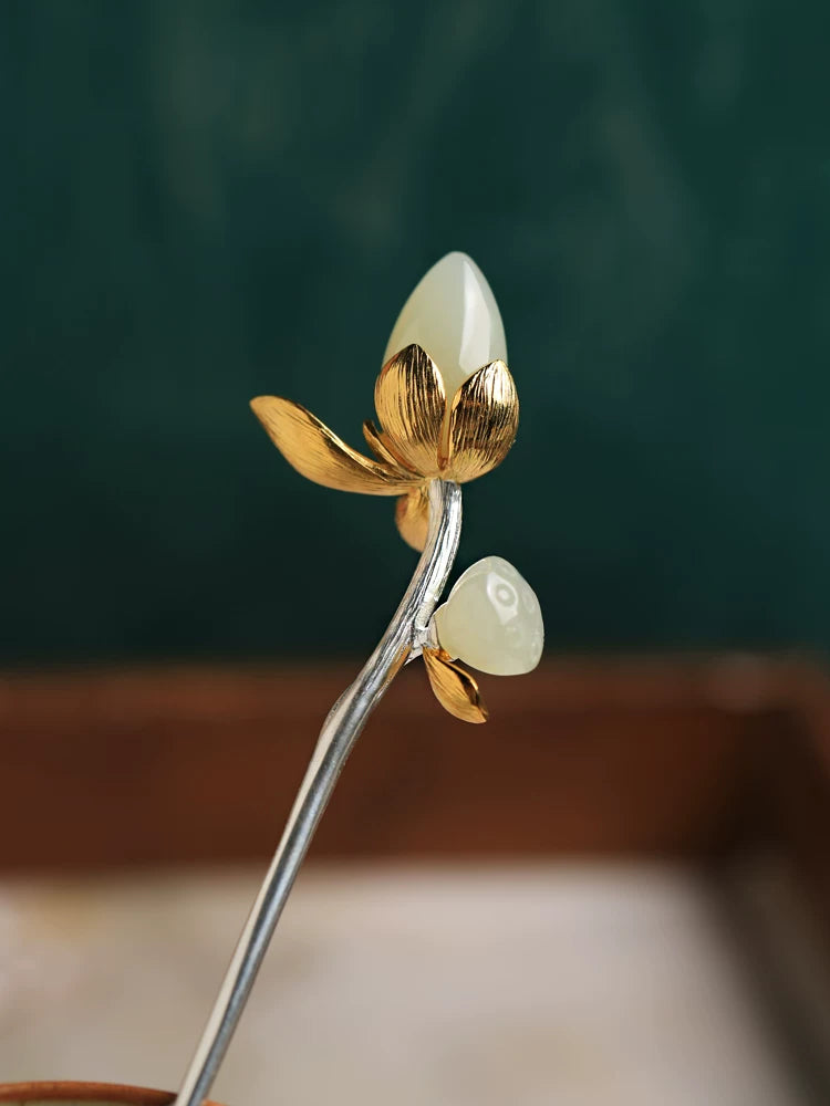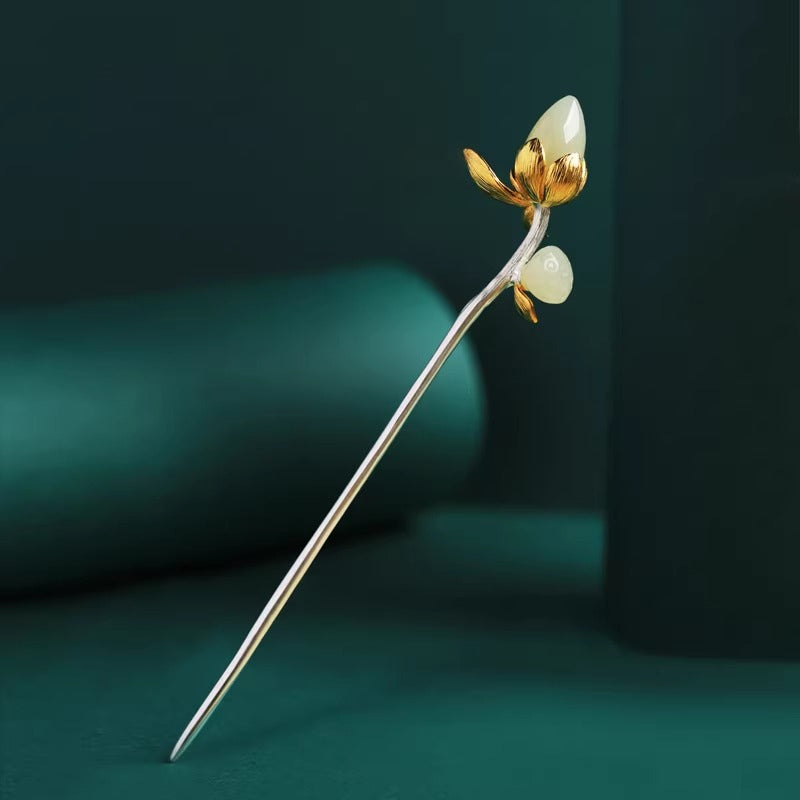 Hetian Jade Lotus Silver Hairpin