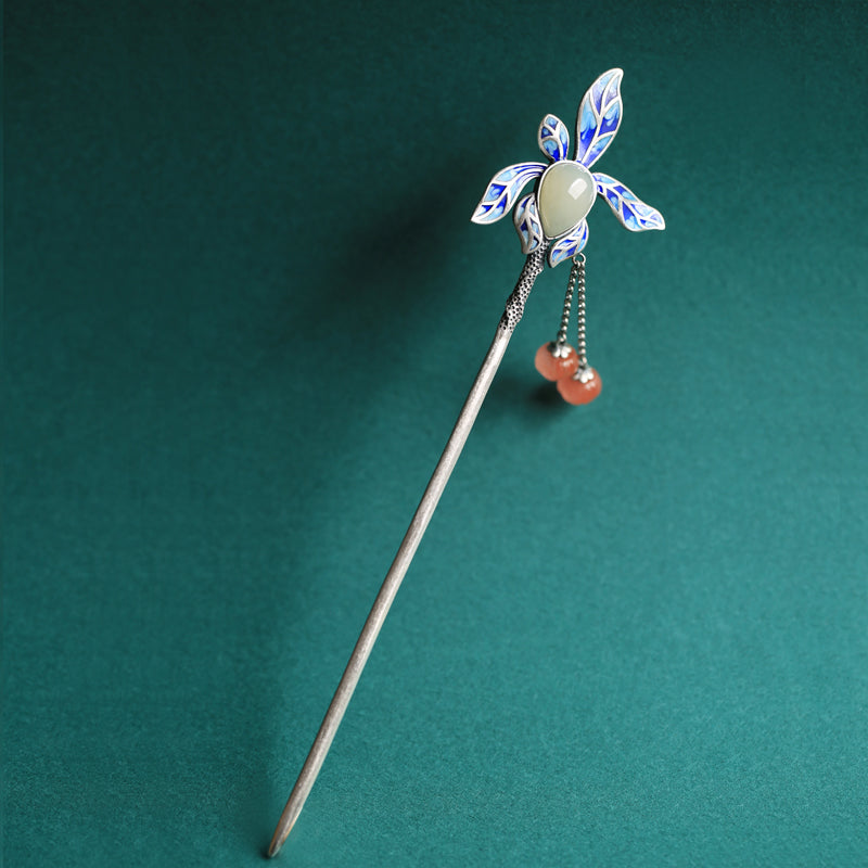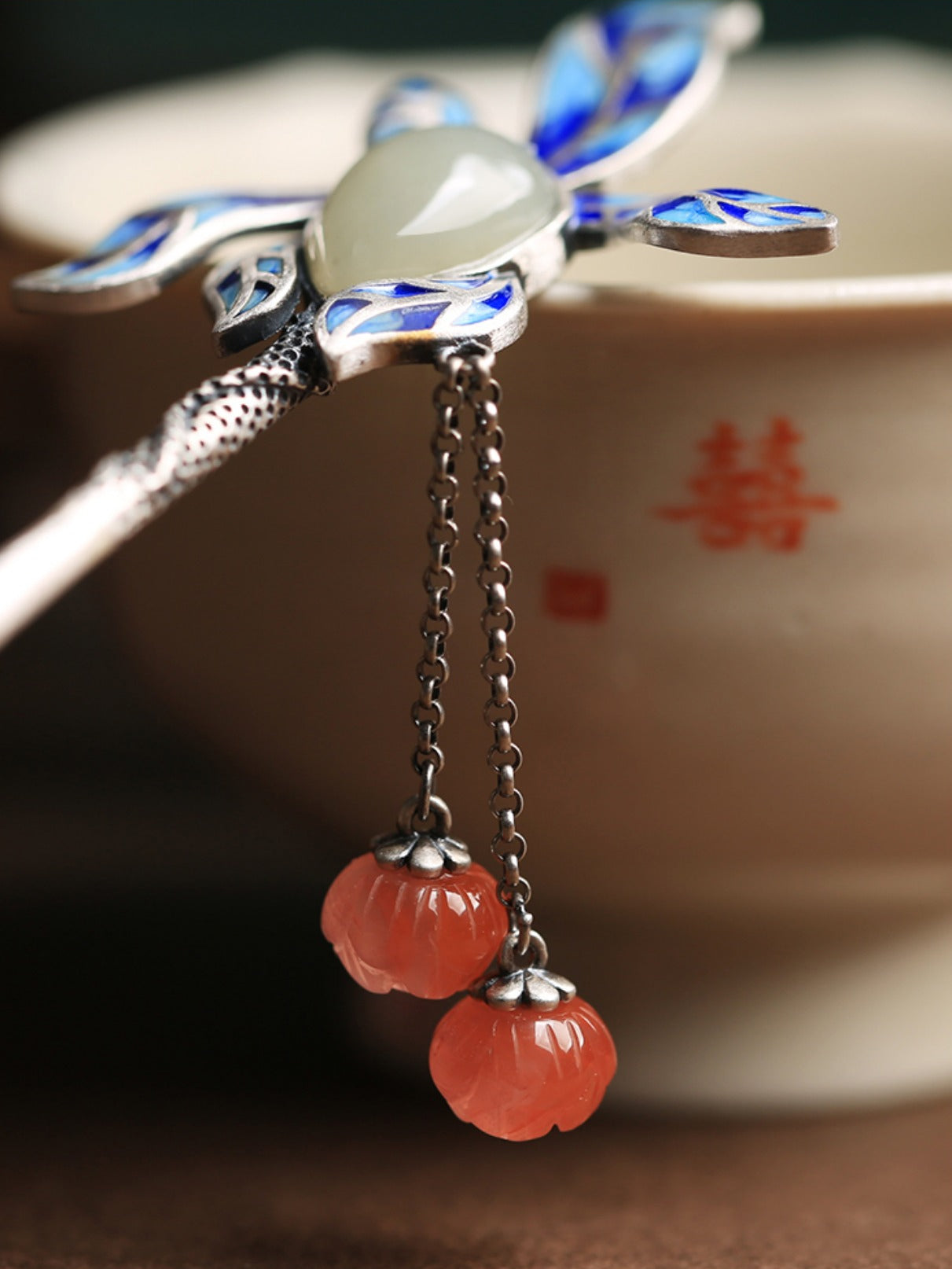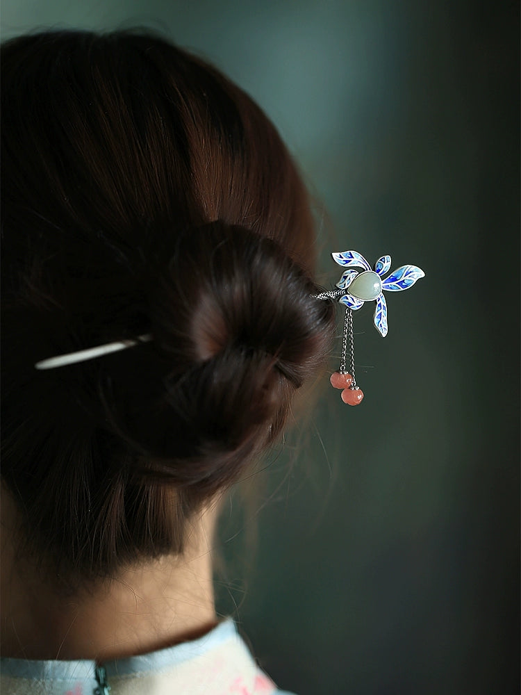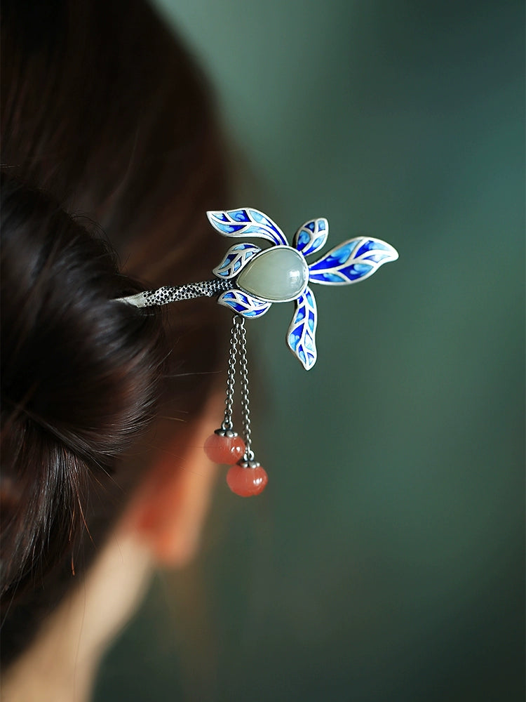 Design: Inspired by the "Lotus", the entire hairpin uses traditional handmade hammering techniques, with enamel glaze on the lotus leaves, giving a strong handmade and antique feel. The jade is selected from natural Hetian jade, which has a delicate and moist texture. The hanging tassel is a lotus flower carved from natural red agate. The metal body is made of S925 silver, with aged details, clear and natural patterns, full embossing, and a matte silver texture, exuding a high-grade feel. For those who like classical styles, don't miss out, it's suitable both for gifting and personal use.