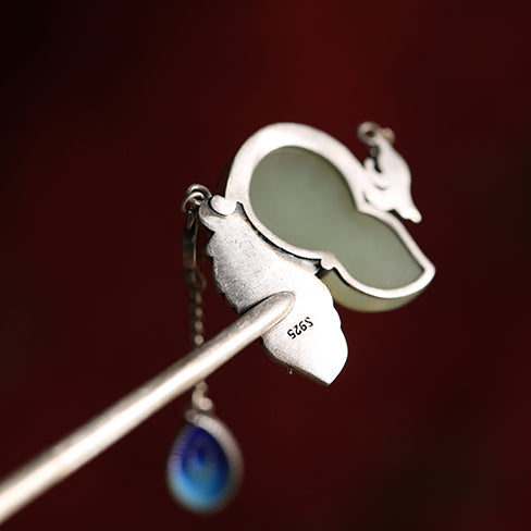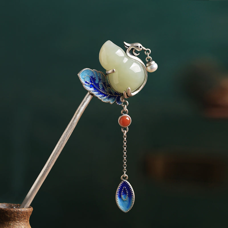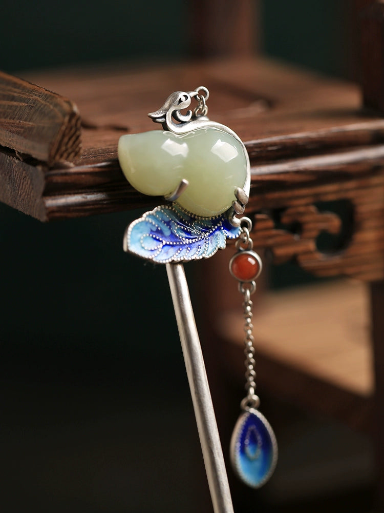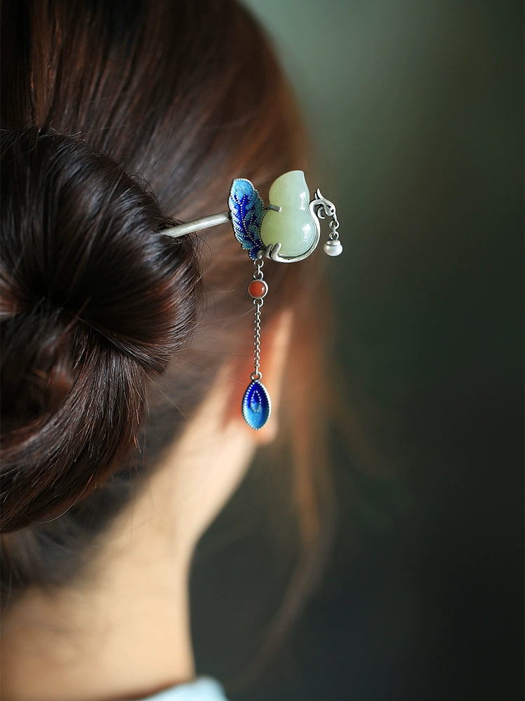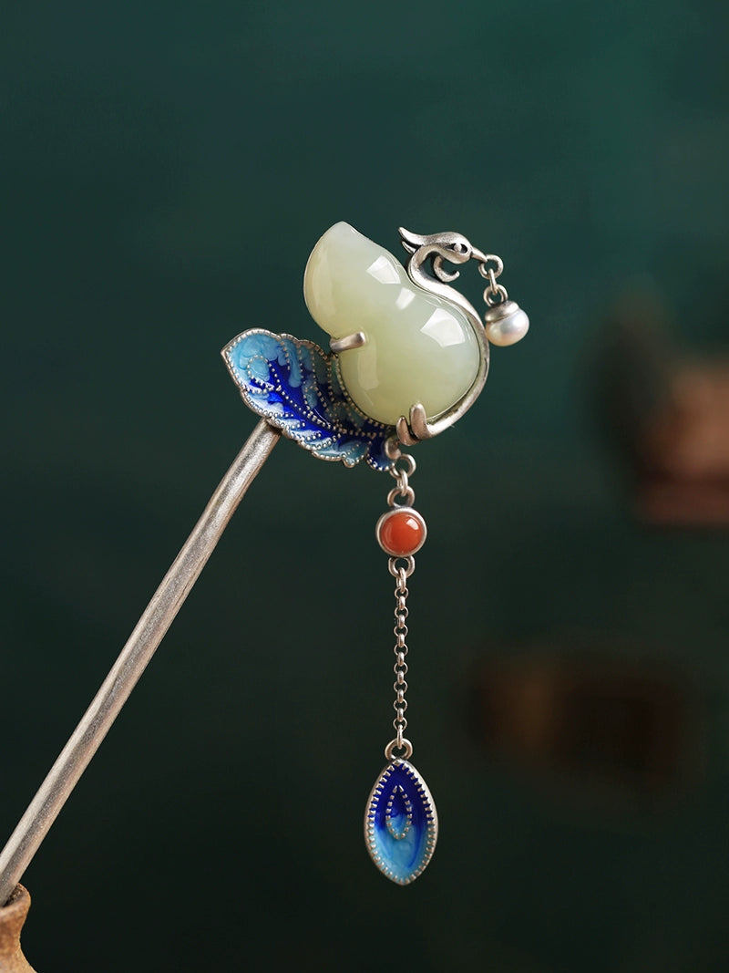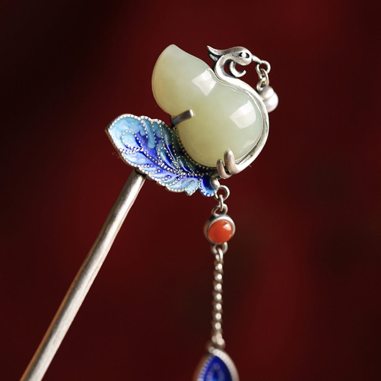 Design: This intricately designed hair stick takes "peacock" as its element. The body of the peacock is a jade gourd, symbolizing "fortune and prosperity". The beak holds a natural freshwater pearl. The wings and tail are crafted with enamel glaze, giving a strong, handmade, vintage feel. The jade is selected from natural Hetian jade, which has a delicate and moist texture. The hanging tassel's red part is natural red agate. The metal is made of S925 silver, with a sense of age in the details. The patterns are clear and natural, the embossment is complete, and the matte texture of the silver is high-grade. For those who like the classical style, don't miss out, it's suitable for both gifting and personal use, please feel free to buy it.