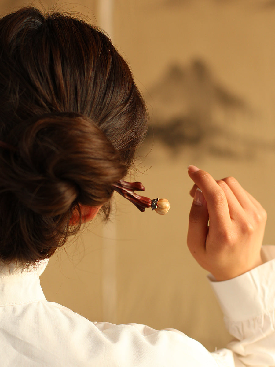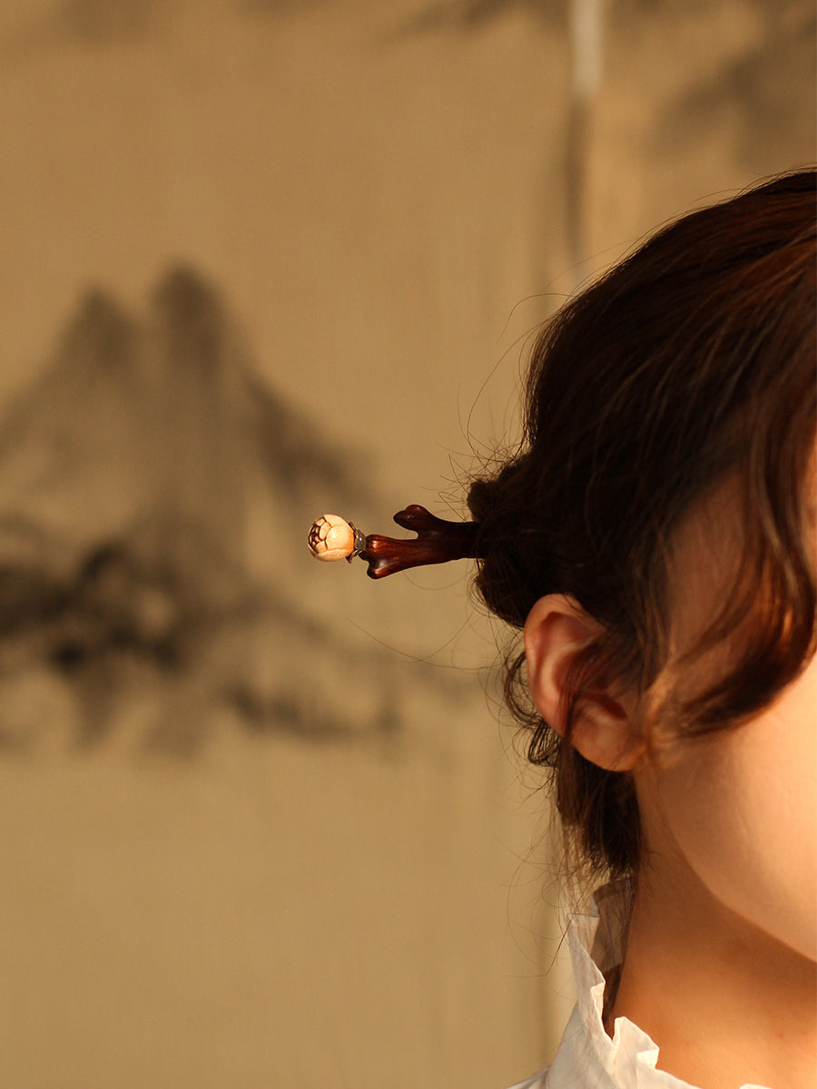 Design: "Plum Intention" is a continuation of my floral and plant themes. Inspired by the poem "Sparse shadows slanting, water clear and shallow, a faint fragrance floats in the yellow moon dusk," this design still comes from it. I previously designed a limited edition "Plum Life," but suitable small-leaf rosewood material was really hard to find. After making about 20 pieces, the material was still used up. I didn't want to simply change the material without changing the design, so I decided to redesign this plum blossom hair stick.