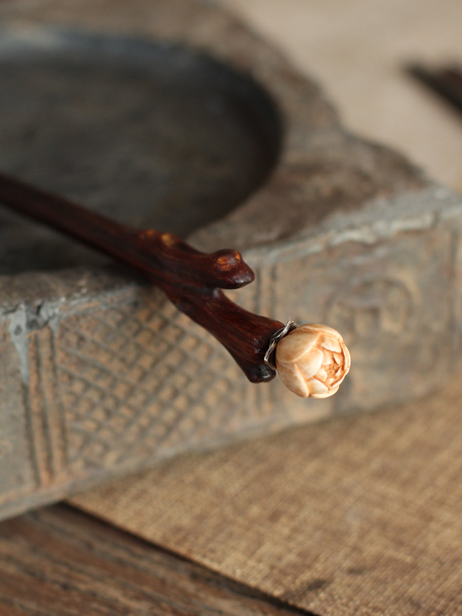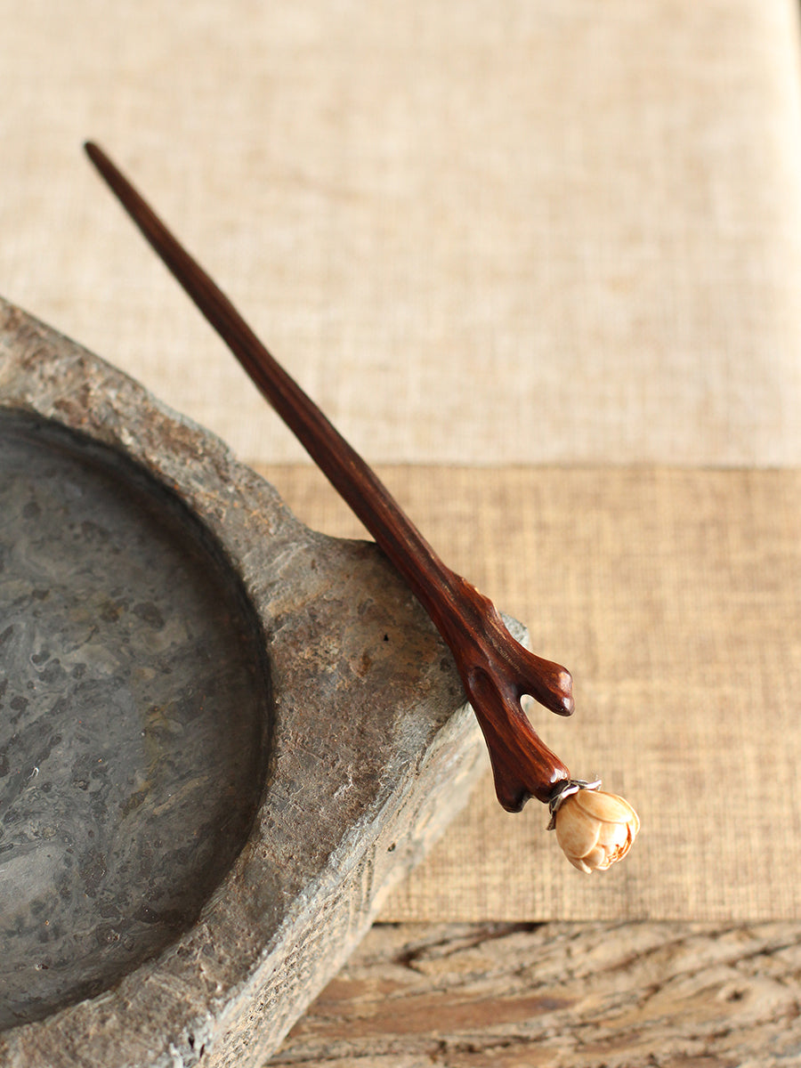 "Plum Intention" - Floral Design Hair Stick Hand-Crafted with Yellow Rosewood, 999 Silver, and Elk Horn