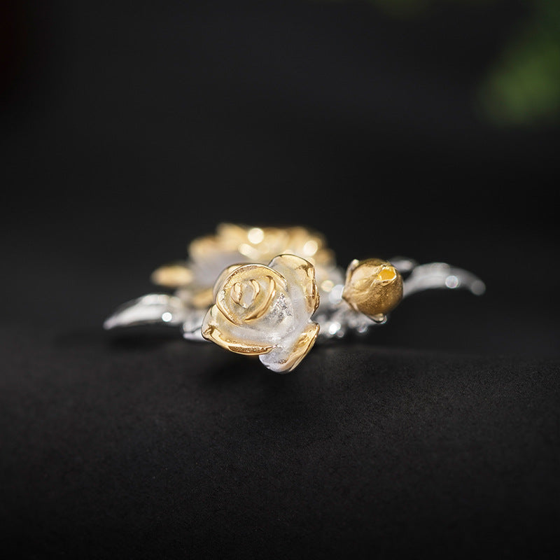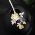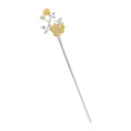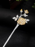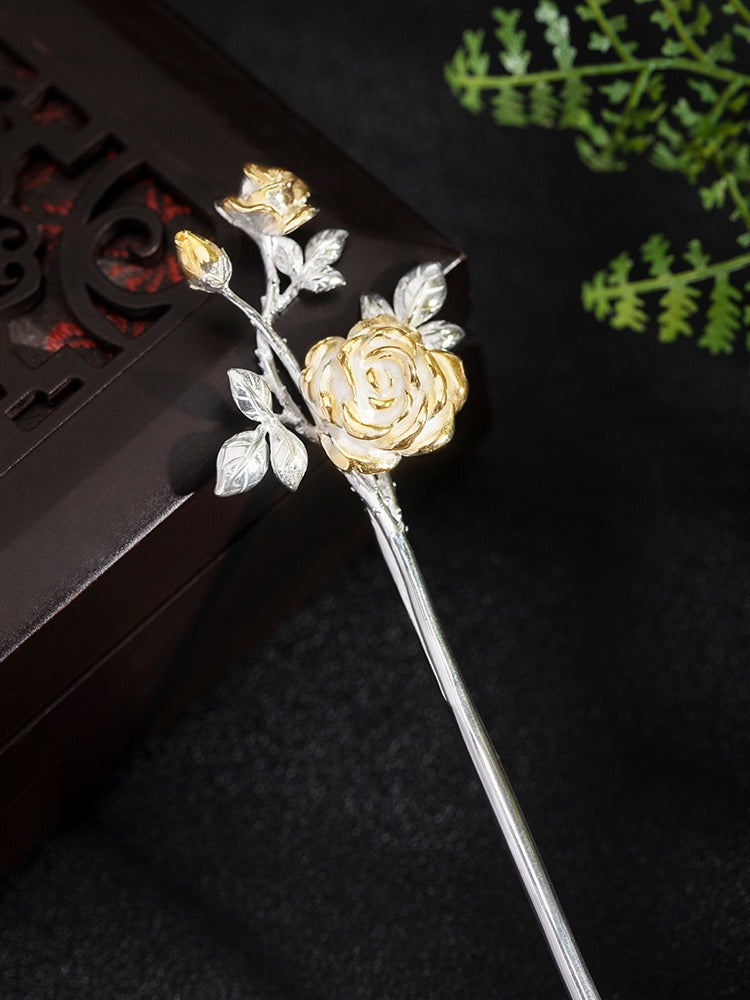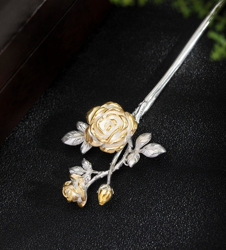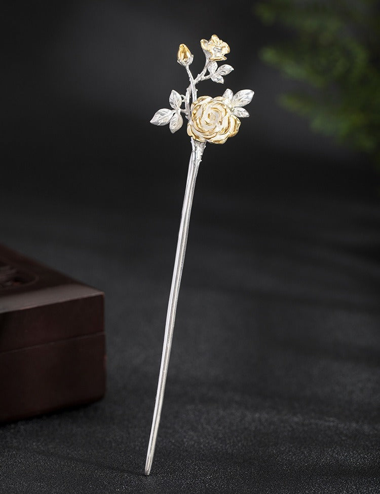 Design: Silver hair stick with a rose motif, clean and unadorned without tassels.