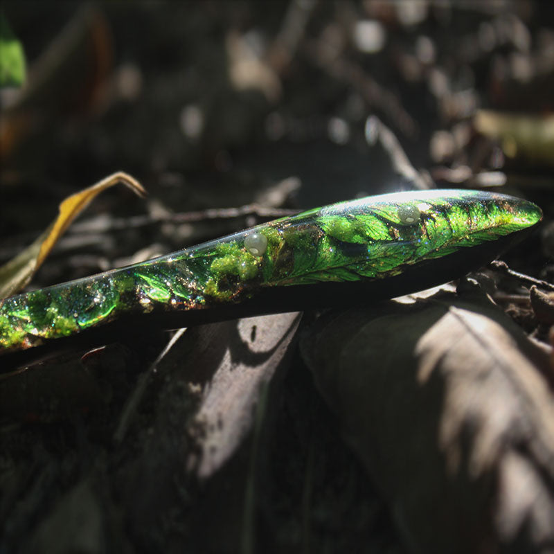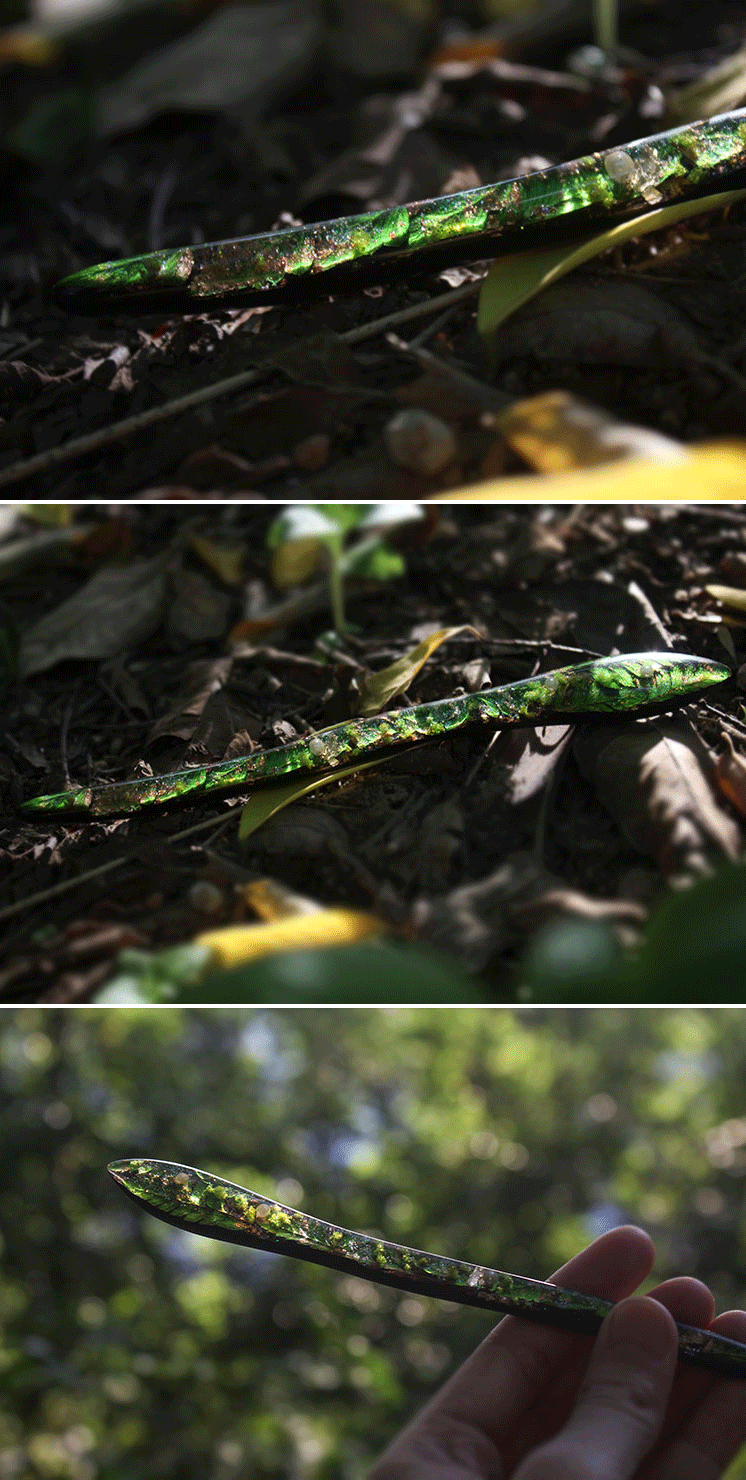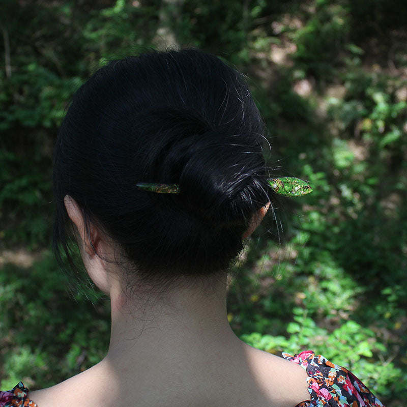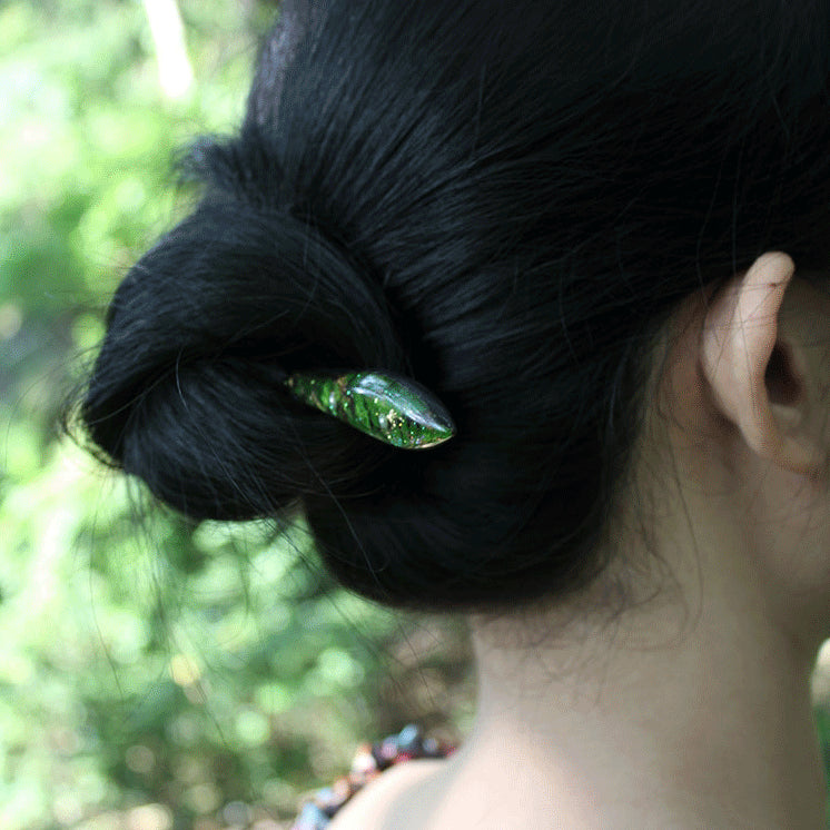 - This Mori-style hair stick is inspired by the forest. Made of high-quality black sandalwood(ebony) and resin which is decorated with preserved flowers and leaves. It’s a must-have hair accessory of Mori style.