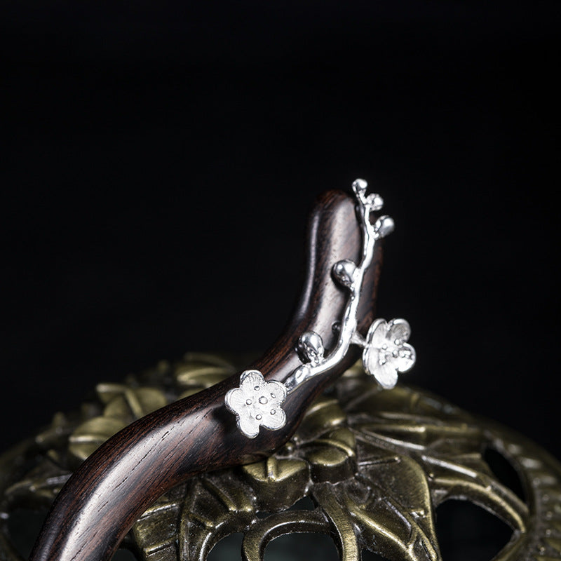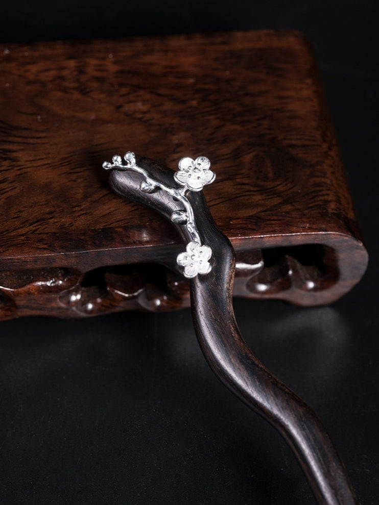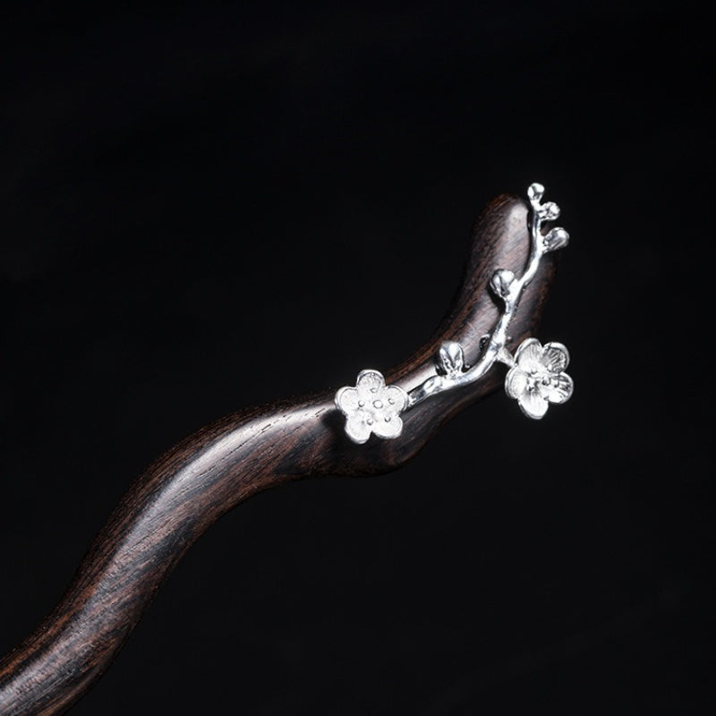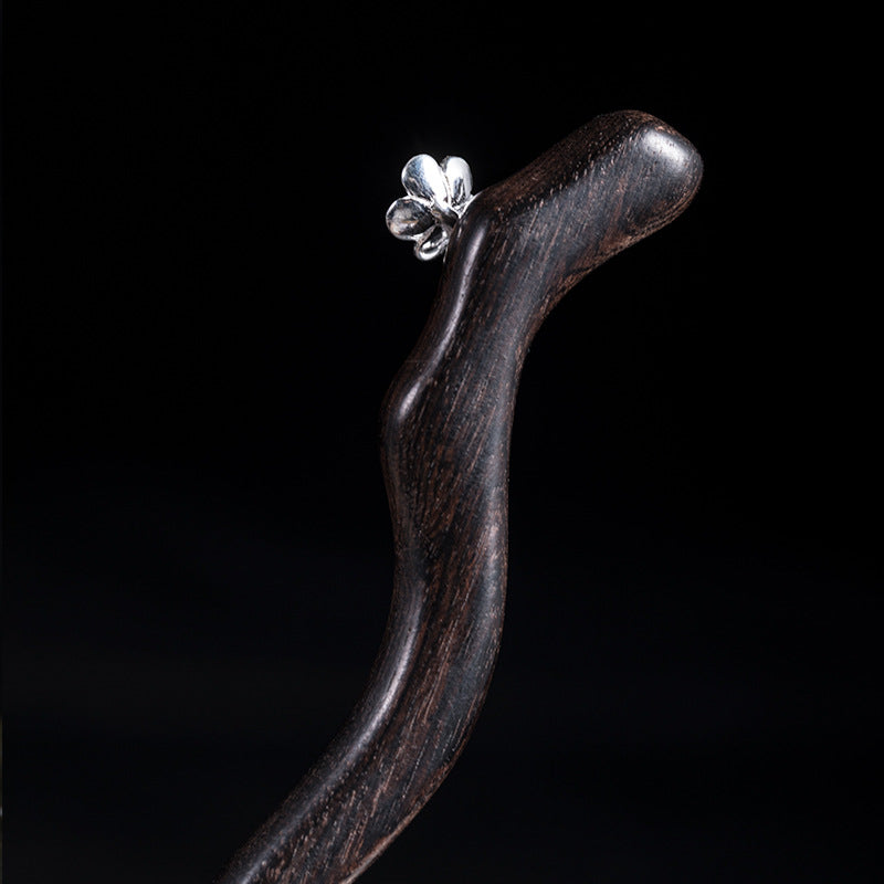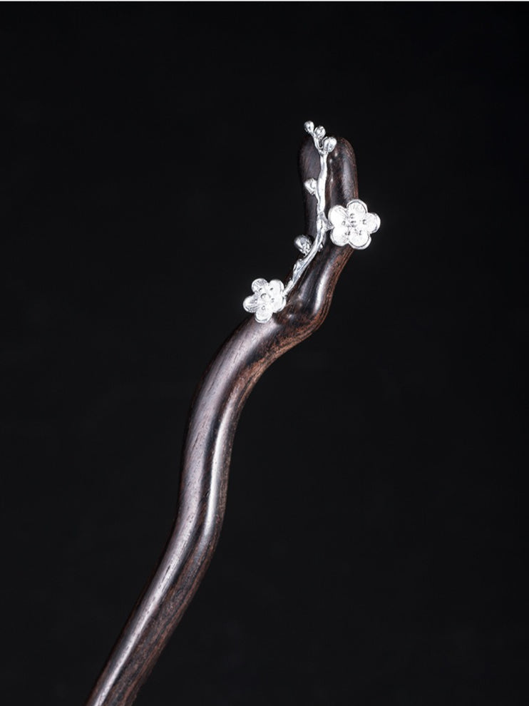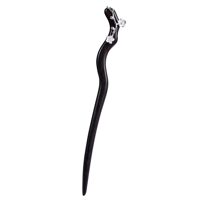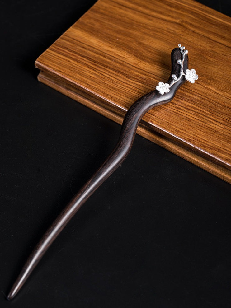 Design: Natural ebony wood combined with silver plum blossoms, it combines the warmth of ebony with the delicacy of silver, making it a durable and good-looking hair stick.